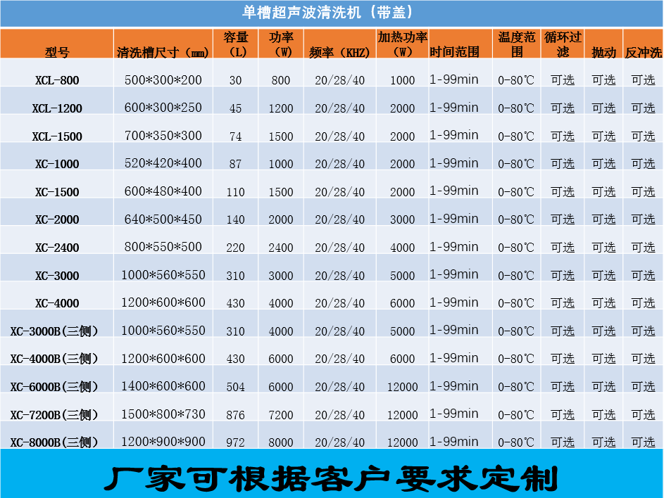 單槽超聲波清洗機(jī)是由超聲發(fā)生源與清洗槽分體結(jié)構(gòu)設(shè)計(jì),內(nèi)外全不銹鋼制作,使用方便,易于保養(yǎng)。超聲換能器可采用單方位或多方位輻射,功率強(qiáng)勁,清洗效果好。可根據(jù)用戶需要增設(shè)功率調(diào)節(jié)、時(shí)間、溫度、水位自動(dòng)控制及工件自動(dòng)運(yùn)行等功能,適用于清洗難度較大及清潔度要求較高的各種工件的清洗。