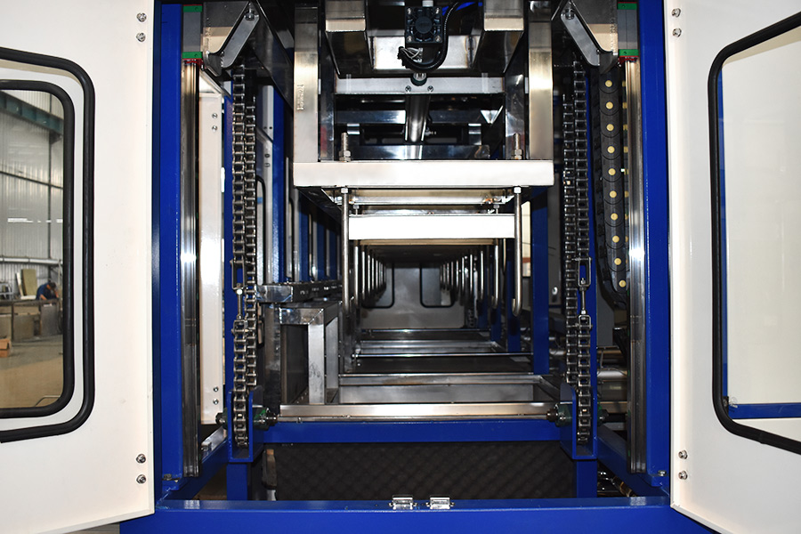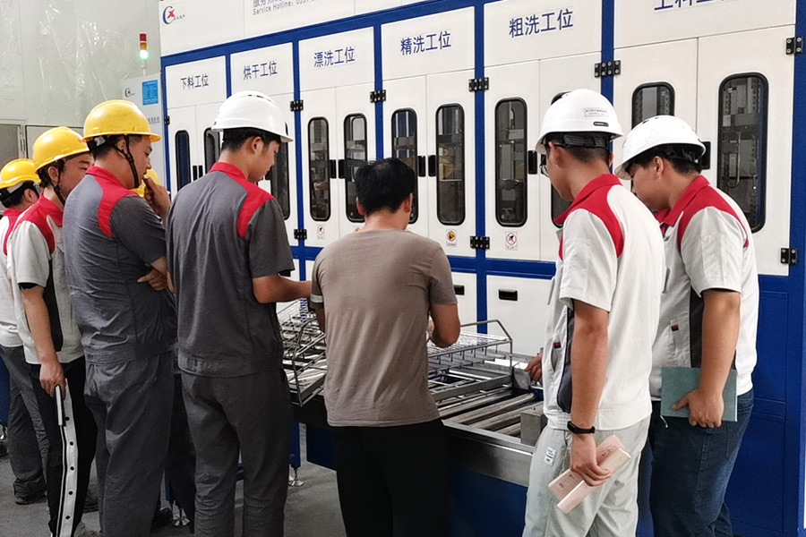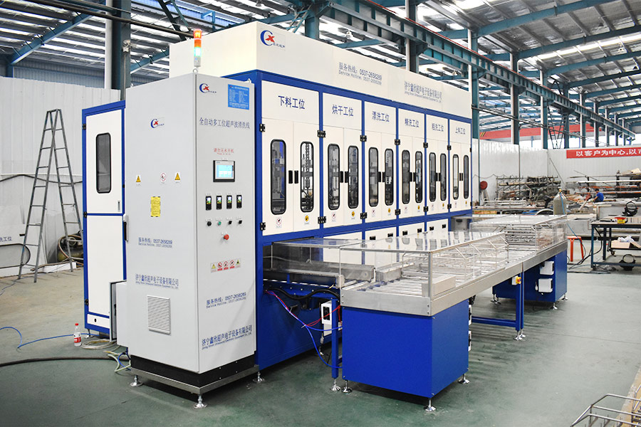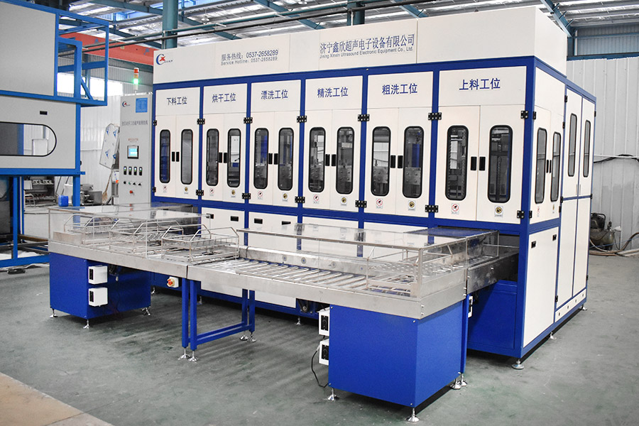該設備有自動上下料及轉角系統(tǒng)、超聲波清洗系統(tǒng),自動拋動、自動溢流和油污分離裝置,噴淋系統(tǒng)、自動高壓切水系統(tǒng)、自動烘干系統(tǒng)。機械手自動輸送系統(tǒng)采用高精度直線導軌配合高精度位置檢測傳感器,機械手可以準確的實現(xiàn)工件的抓取和放置。自動進排液和自動加溫系統(tǒng)完全實現(xiàn)了無人干預,自動運行,很大程度上降低了工人的勞動強度。先進的霧氣處理系統(tǒng)可以將清洗時產生的霧氣冷凝回流,空氣經過濾和活性炭吸附后排出。
