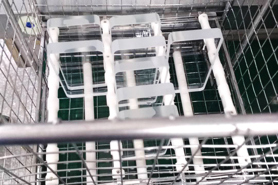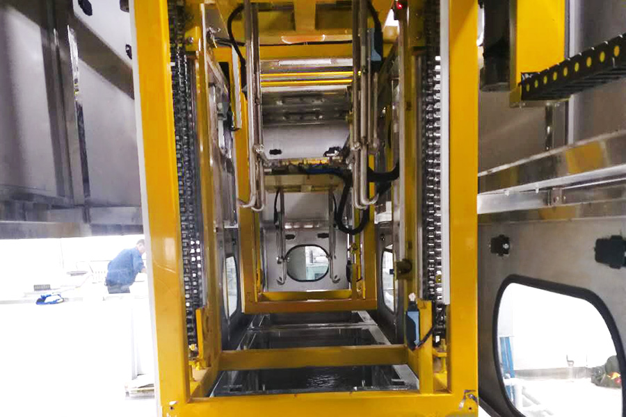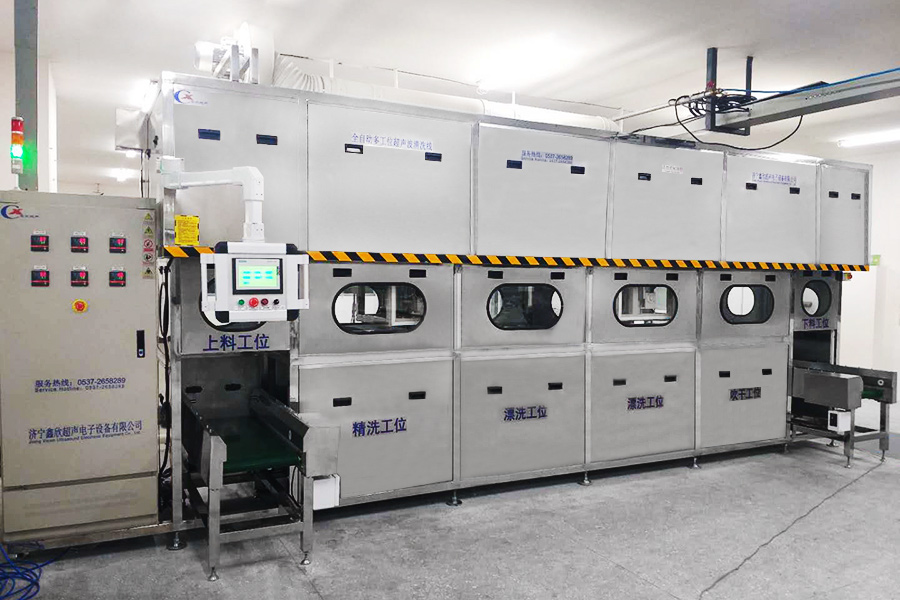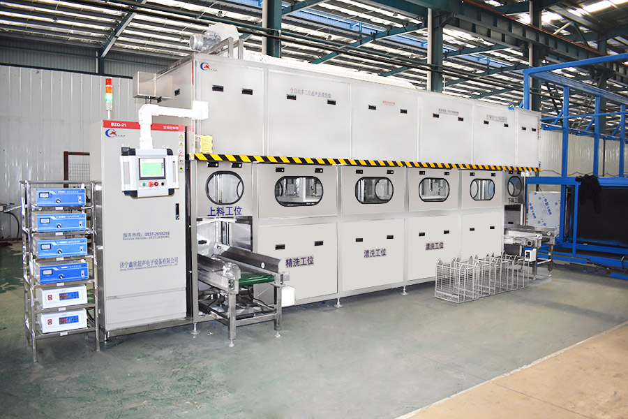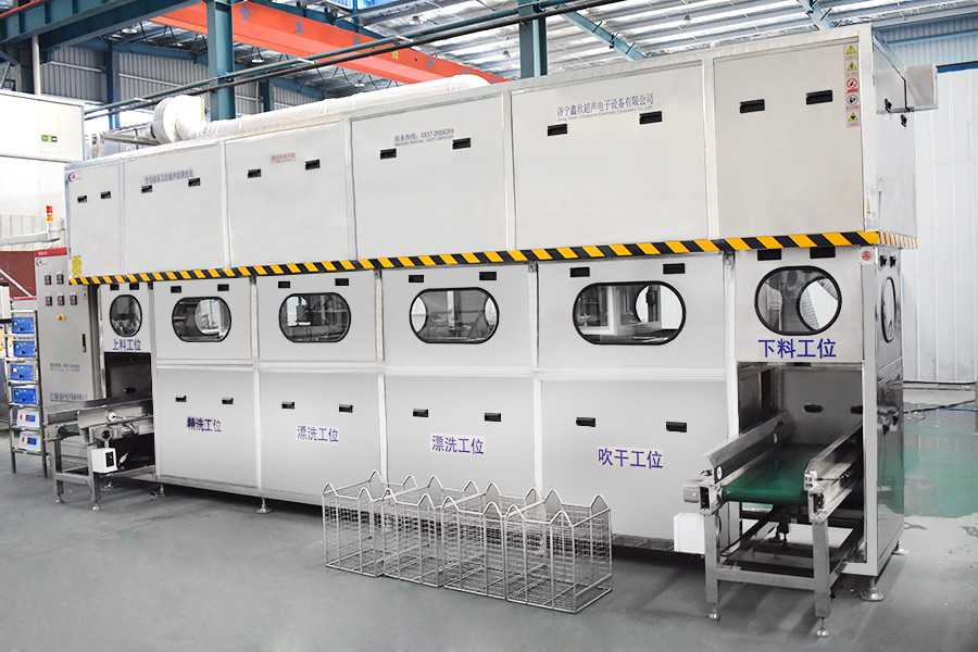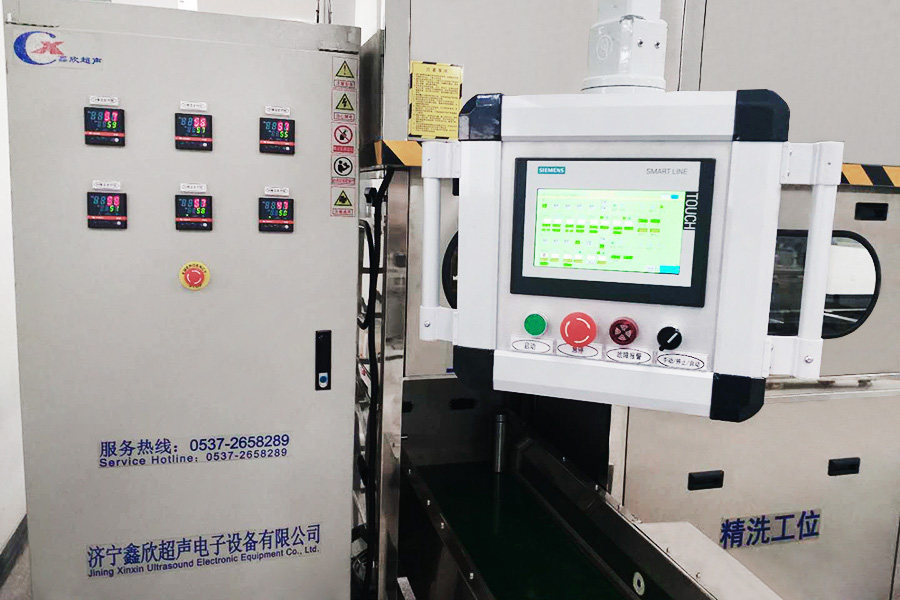 該設備有自動上下料及轉角系統、超聲波清洗系統,自動拋動、自動溢流和油污分離裝置,噴淋系統、自動高壓切水系統、自動烘干系統。機械手自動輸送系統采用高精度直線導軌配合高精度位置檢測傳感器,機械手可以準確的實現工件的抓取和放置。自動進排液和自動加溫系統完全實現了無人干預,自動運行,很大程度上降低了工人的勞動強度。先進的霧氣處理系統可以將清洗時產生的霧氣冷凝回流,空氣經過濾和活性炭吸附后排出。