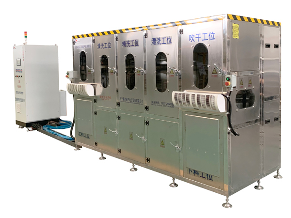 該設備有自動上下料及轉角系統、超聲波清洗系統,自動拋動、自動溢流和油污分離裝置,浸泡系統、鼓泡系統、超聲波清洗系統,下料風切系統。機械手自動輸送系統采用高精度直線導軌配合高精度位置檢測傳感器,機械手可以準確的實現工件的抓取和放置。自動進排液和自動加溫系統完全實現了無人干預,自動運行,很大程度上降低了工人的勞動強度。先進的霧氣處理系統可以將清洗時產生的霧氣冷凝回流,空氣經過濾和活性炭吸附后排出。